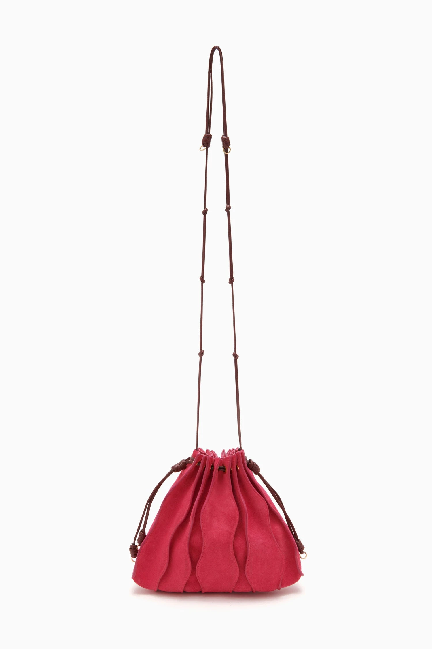 As featured in Look 5 of our Pre-Fall ’23 Lookbook, the Adria Small Pleated Wave Bag is a gorgeous new addition to our handbag collection, defined by undulating seams that adorn its sumptuous leather exterior in a pink colorblock. This crossbody bag features a drawstring opening and is finished with shiny brass detailing.