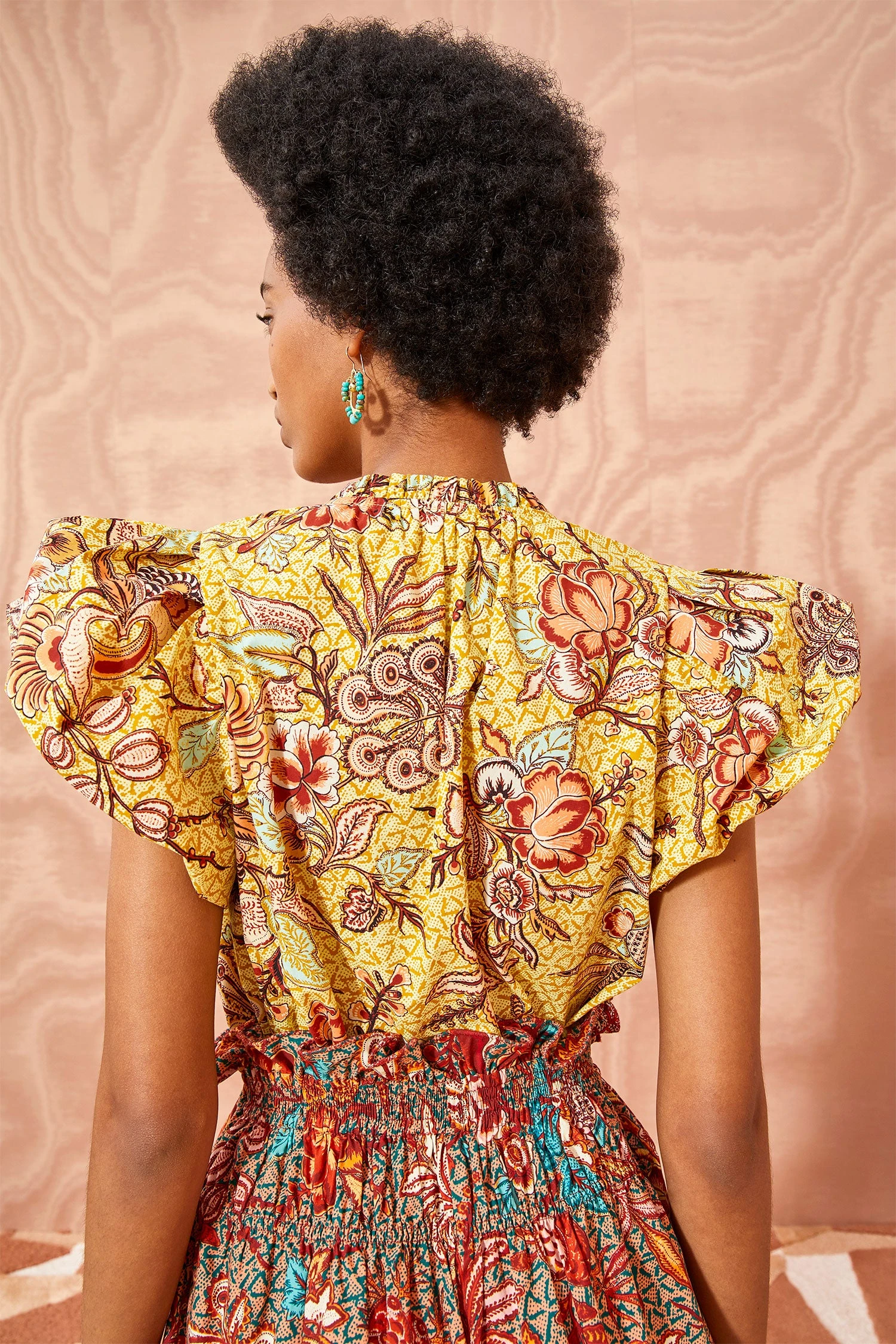 The Evelyn top is crafted from our wild hibiscus printed cotton poplin, a bold floral boasting lively hues of yellow and red. This lightweight short-sleeved top features a split neckline and flutter sleeves. Pair it with the Acacia Skirt in Calla Lilly for a matching set, or mix with other monochrome or printed poplin pieces from the PF23 season for a playful look.