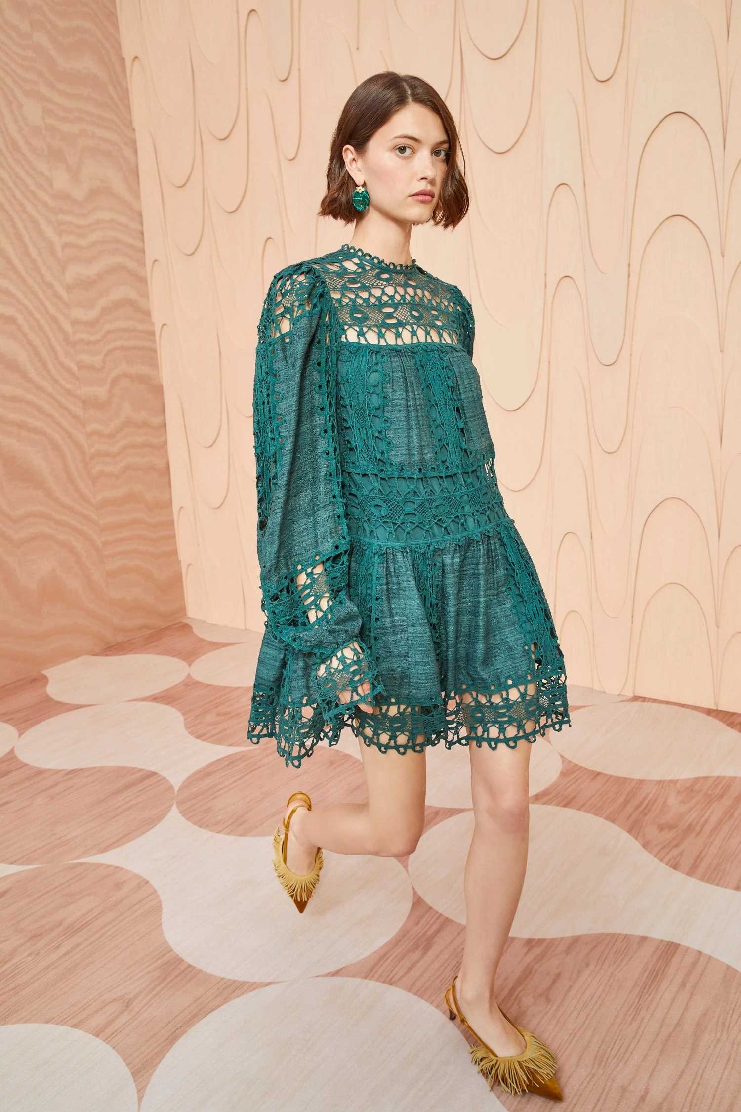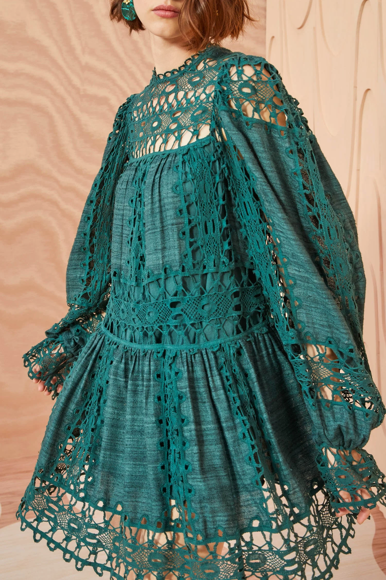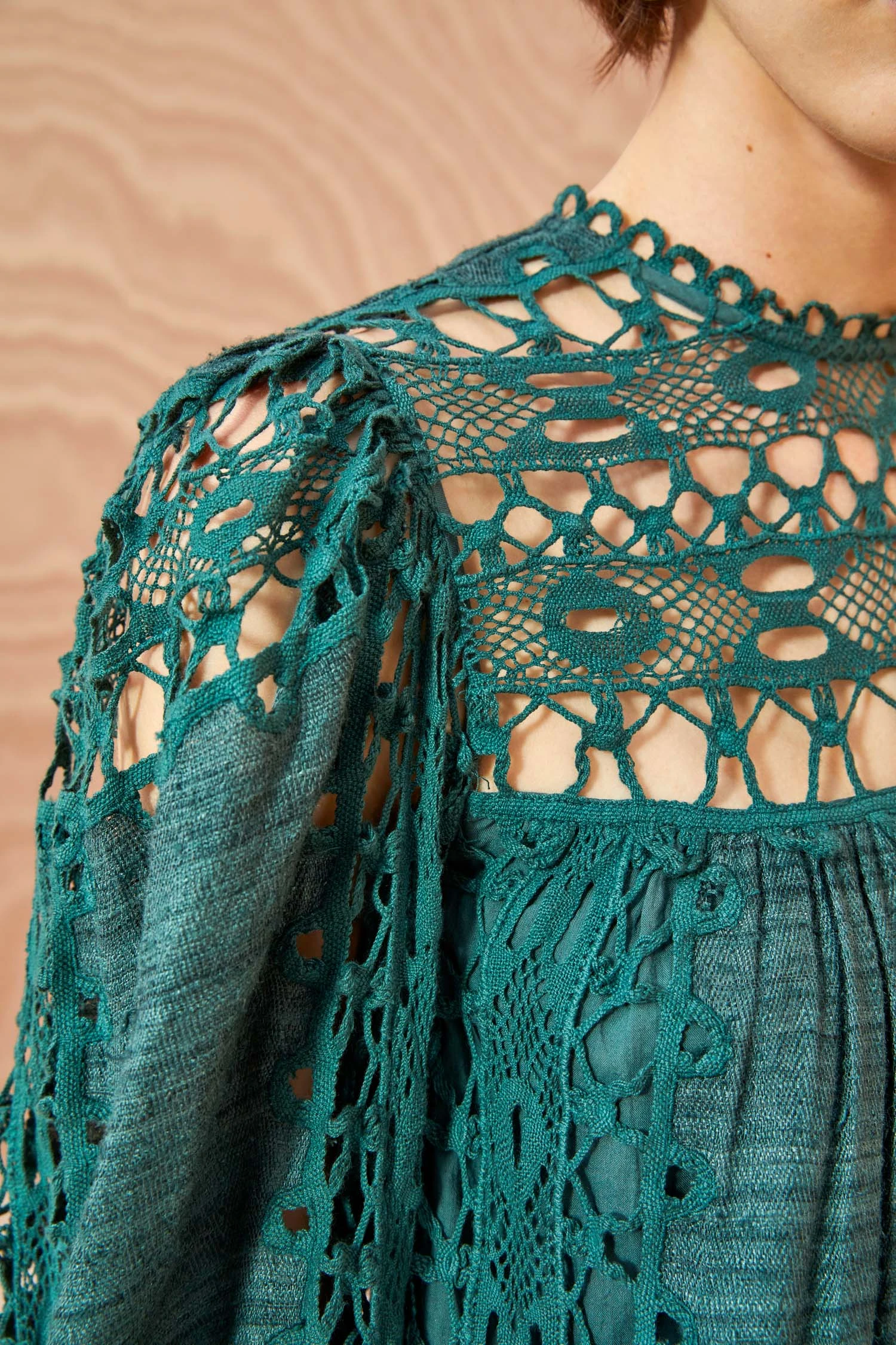 A standout mini silhouette, the Lata Dress is beautifully made from our hand-loomed silk Khadi fabrication with geometric lace inserts that play between sheerness and opacity. This dark green dress features elegant long sleeves, a dropped waist, and a hidden center-back zipper.