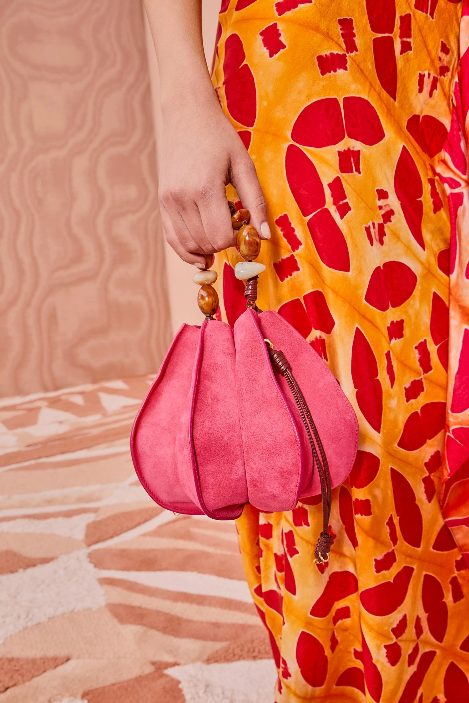 The Lotus Flower Pochette returns this season in a vibrant pink colorblock. Crafted in Italy, this sculptural and imaginative bag is inspired by the ceramic works of Ursula Morley-Price. Built from soft leather and lined with sumptuous suede, it features a resin-stone removable handle, thin crossbody strap, expandable drawstring opening, and shiny brass hardware.