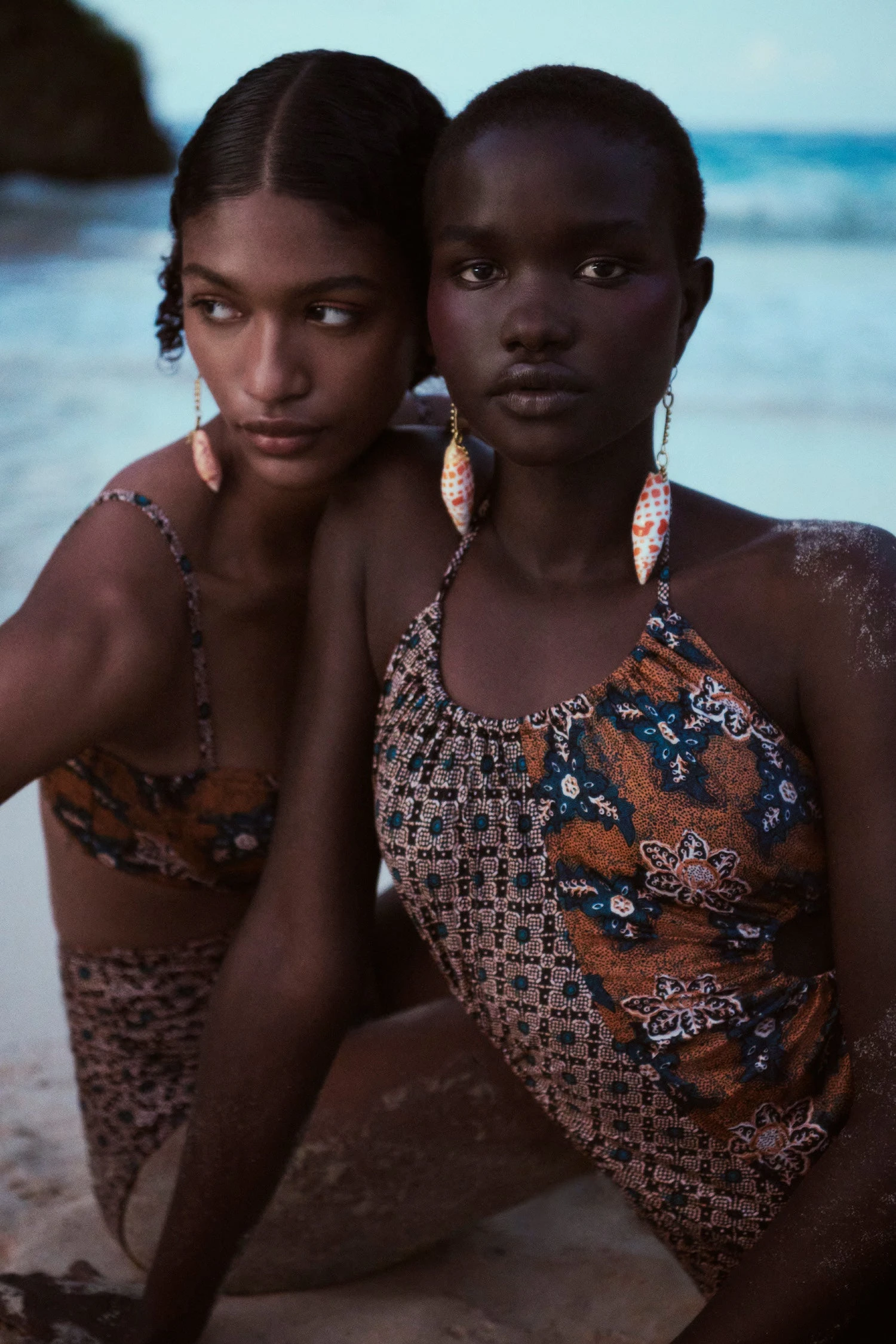 As featured in Look 37 of our Pre-Fall Lookbook, the Mabel Maillot is designed in a two-tone tropical pattern of geometric florals in shades of blue and orange. This one-piece swimsuit has a ruched scoop neck that ties in the back, a cutout detail on each side, and offers moderate coverage throughout.