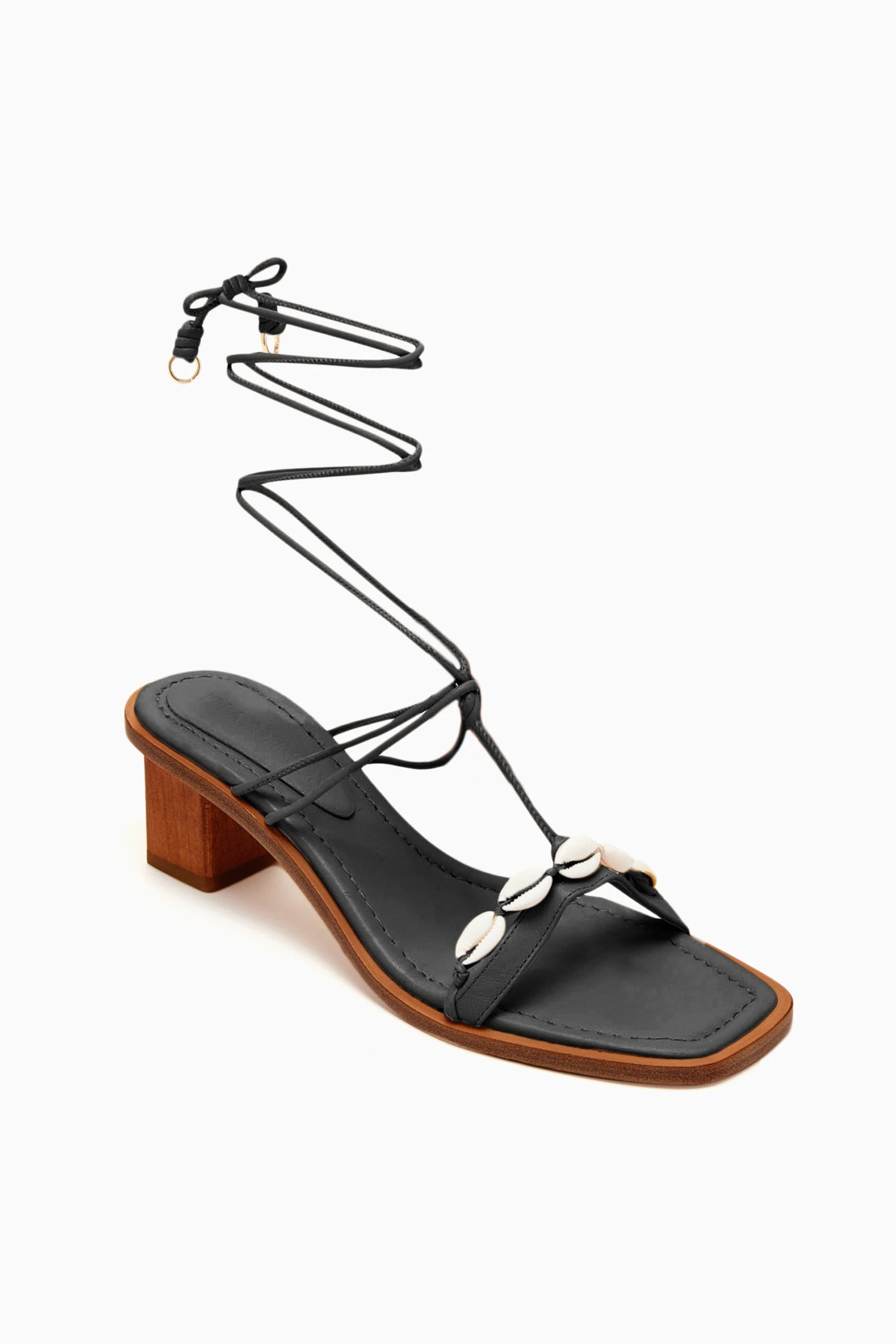 The Nicolette Shell Lace Up High Heel is crafted from luxurious black leather, featuring a wooden heel and cowrie shell details across the front. This exquisite silhouette is finished with a delicate wrap-around ankle strap.