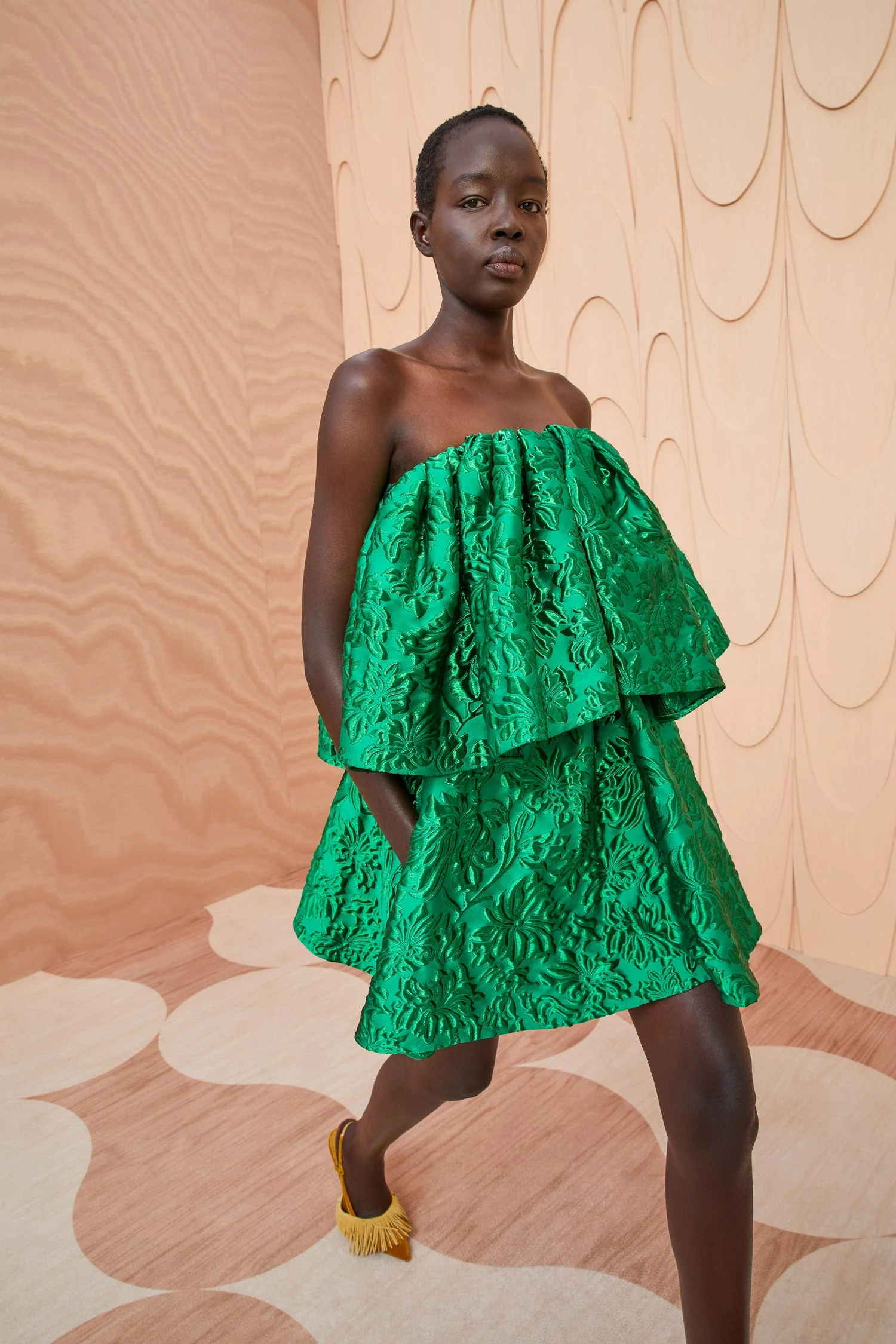 As featured in Look 50 of our Autumn/Winter ’23 Runway Show, the Oui Dress is made from our Italian lurex cloqué jacquard which arrives in an ethereal yet striking monochrome emerald hue. This impactful tiered mini dress features a strapless neckline, light boning within the top lining, and is finished with a side-seam zipper.