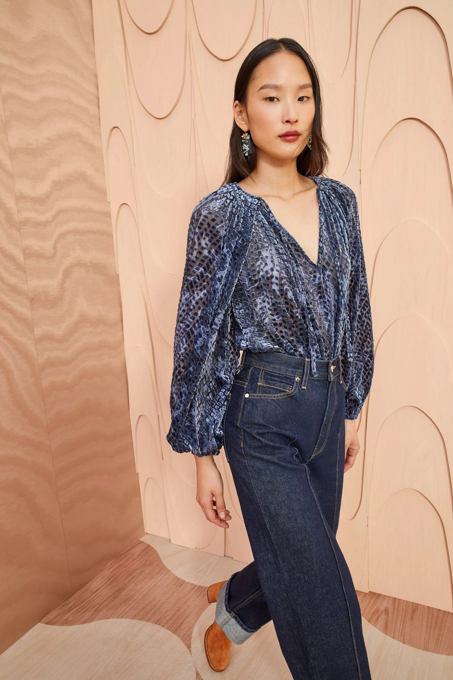 The Pauline Blouse is an Ulla Johnson bestseller reimagined in a rich blue velvet burnout fabrication with a gently swirling moiré motif. This peasant blouse is a loose-fitting silhouette and has long draped sleeves with elastic cuffs. Finished with an open neck and ribbon ties at the neckline.