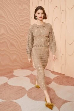 As featured in Look 47 of our Autumn/Winter ’23 Runway Show, the Prisha Dress is made from Italian-spun merino wool that is hand-crocheted into lattice-like stitches, alternating patterns along its length. This beige dress sits close to the body, has full sleeves, and is adorned with small wooden beads.