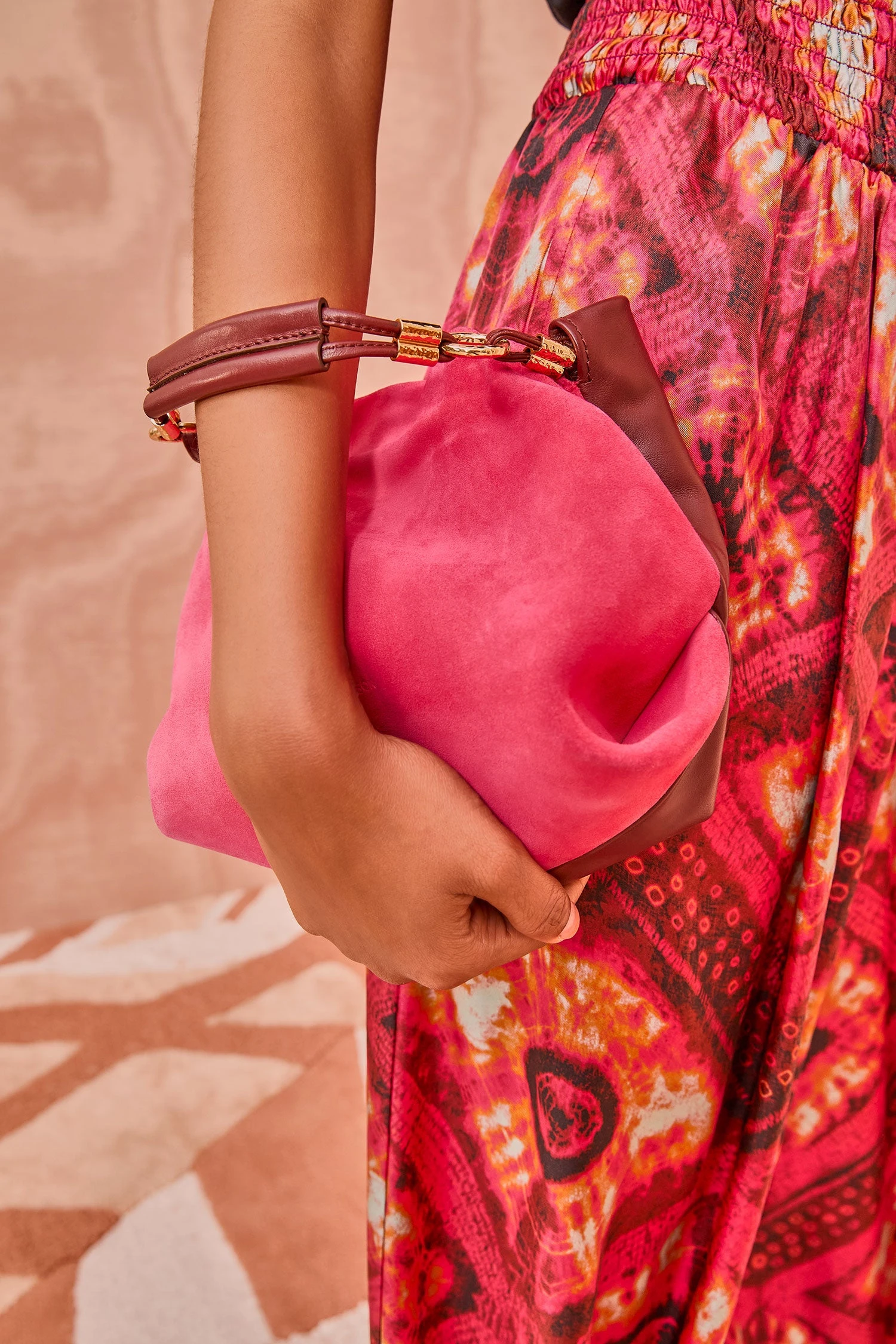 The Remy Mini Handbag, crafted in Italy, is now available in this season’s vibrant pink colorblock suede. This supple leather bag can be worn either as a crossbody, when styled with the long strap, or as a handheld mini with the short handle. The top opening of this silhouette softly gathers when the drawstring is pulled tight at the sides. It is finished with an interior magnet closure and an interior zipper pocket.